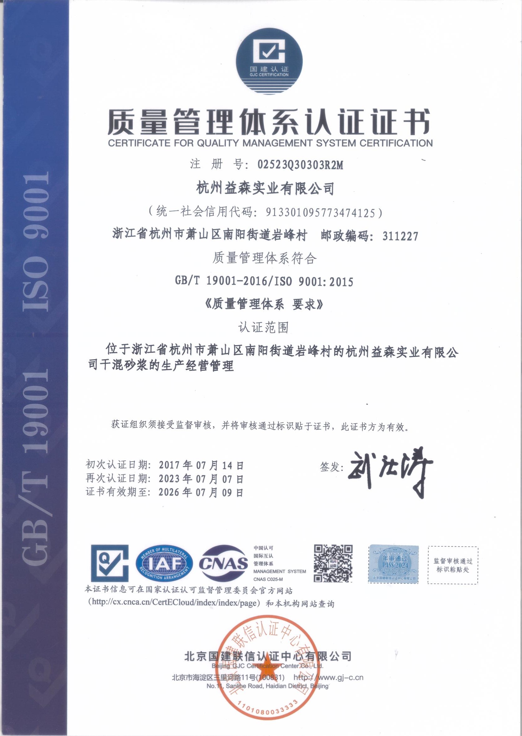 產(chǎn)品認(rèn)證證書(干混地面砂漿)