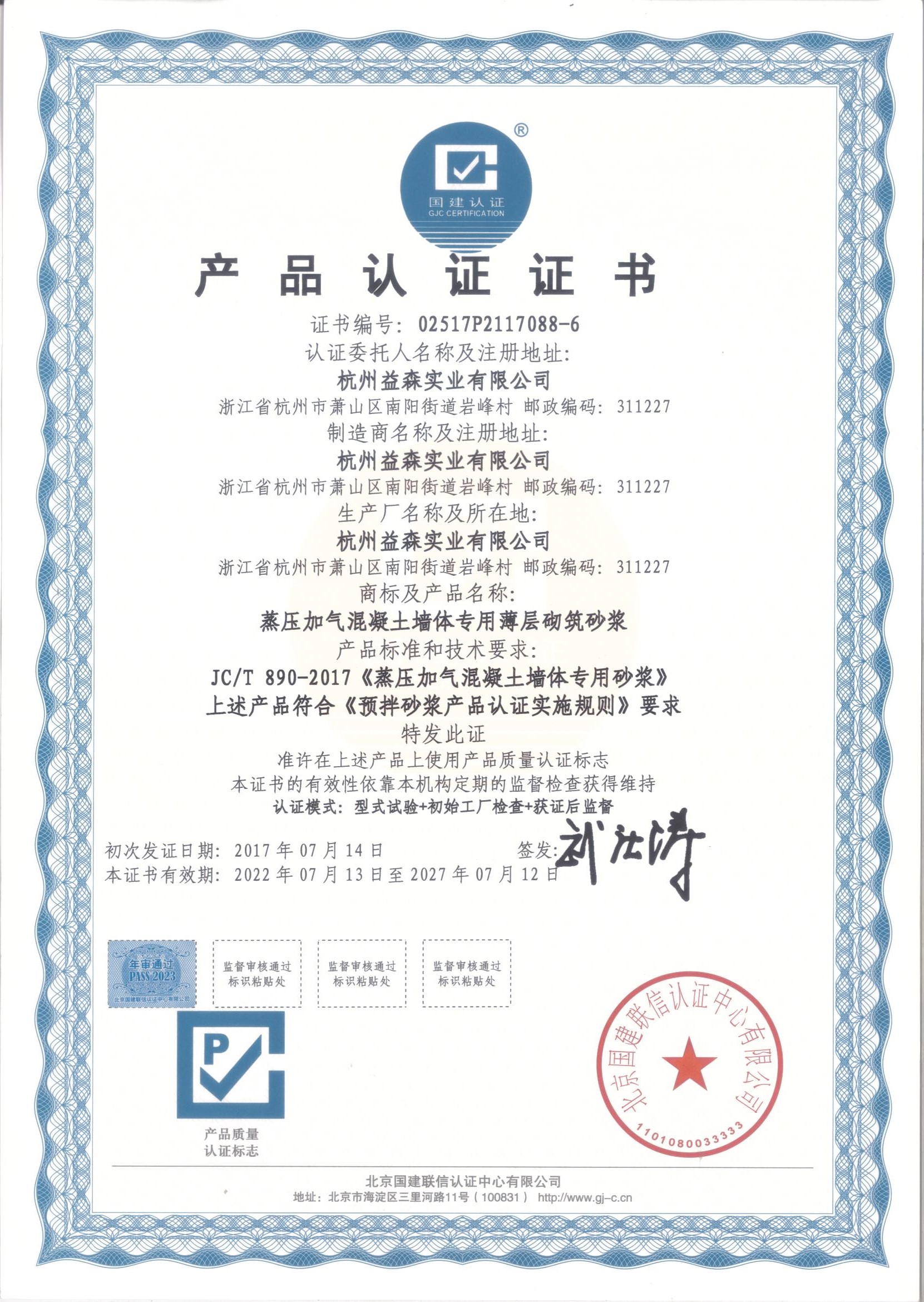 產(chǎn)品認證證書(蒸壓加氣混凝土墻體專用砂漿)