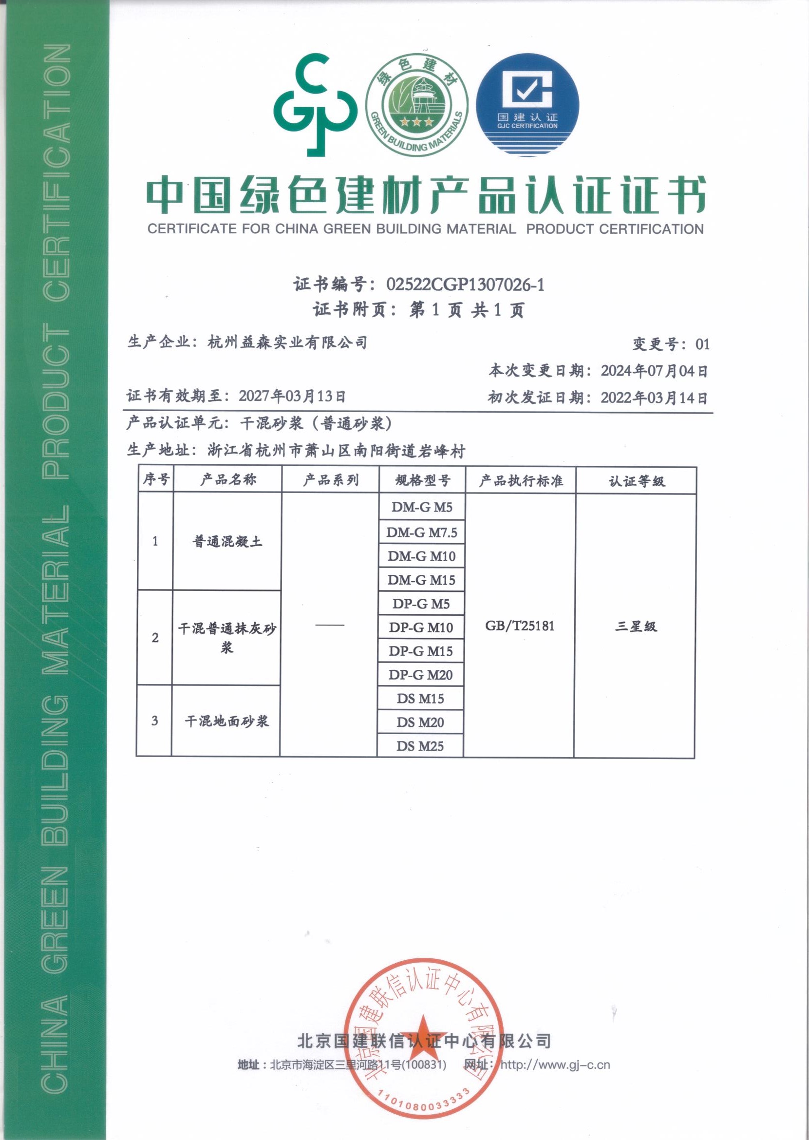 綠色建材認(rèn)證證書(shū)(普通砂漿001)