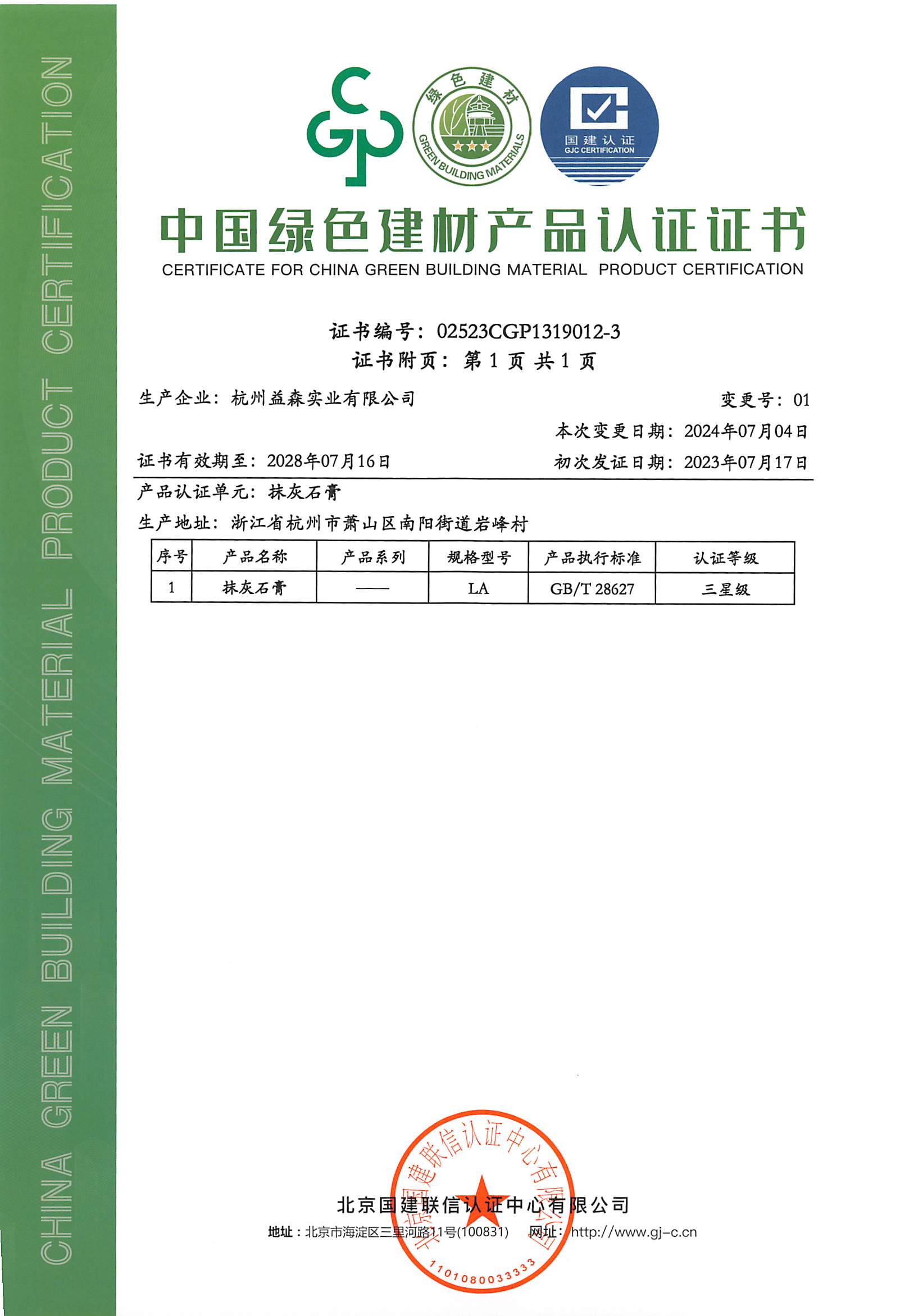 綠色建材認證證書(抹灰石膏001)